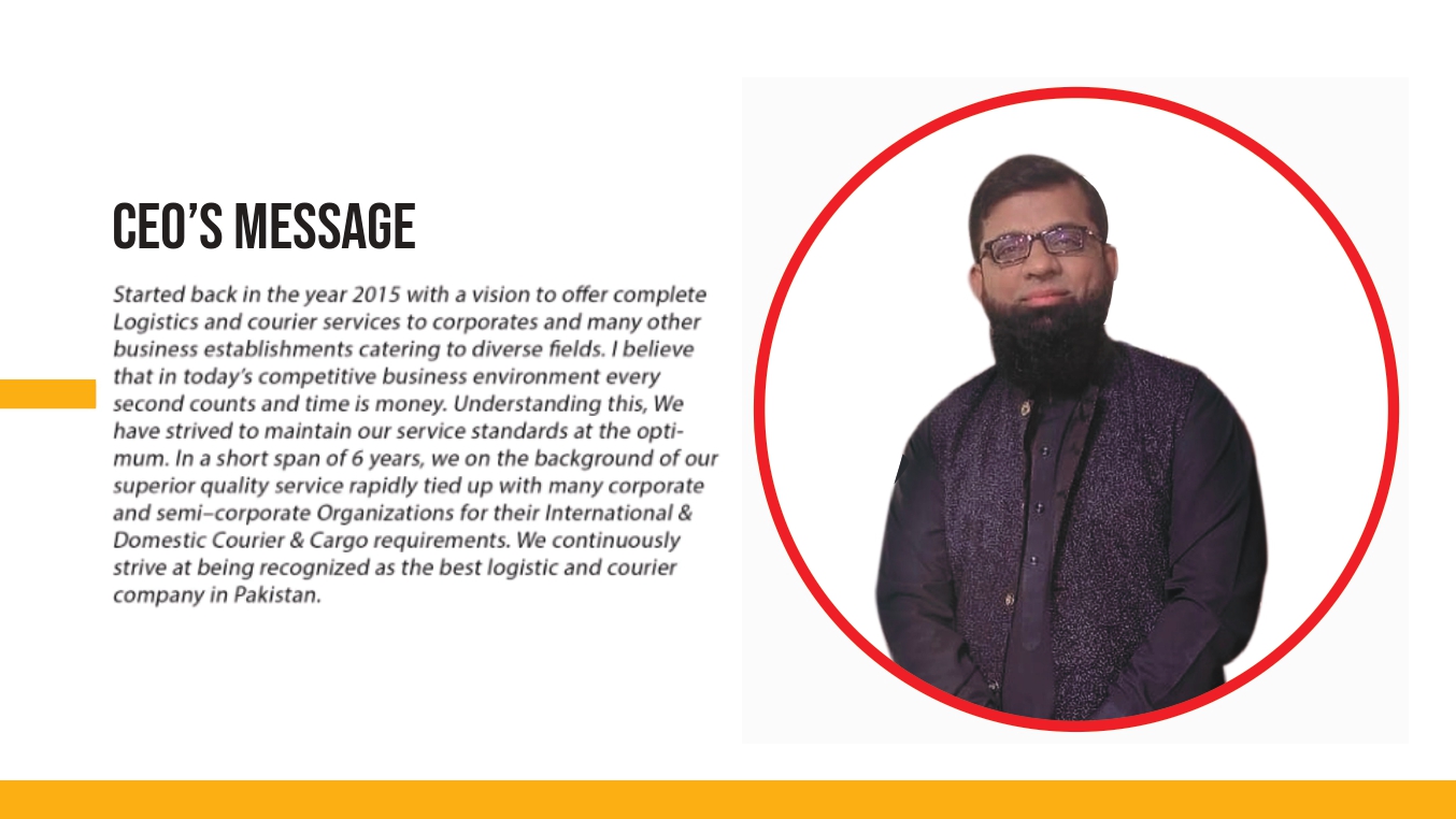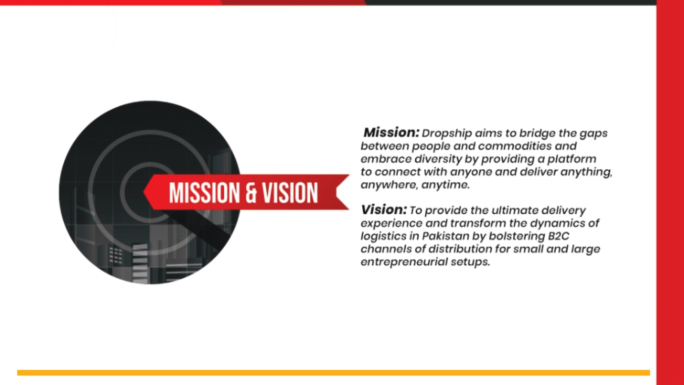 Vision: To provide the ultimate delivery experience and transform the dynamics of logistics in Pakistan by bolstering B2C channels of distribution for small and large entrepreneurial setups. Through friendly services and ease of access to your tailored requirements, we envision to create Pakistan’s fastest and delivery service company.